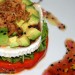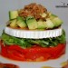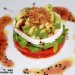 Dispón un aro de emplatar y pon una base de pimientos escalibados, a continuación coloca la rúcula, cúbrela con el queso de cabra y seguidamente dispón el aguacate y la cebolla frita. Termina aderezando con la vinagreta de violetas.