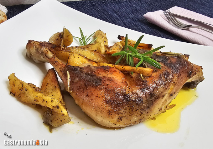 En una bandeja amplia distribuye las patatas, las chirivías y la cebolla. Añade las hojas de romero, sal, pimienta y comino molido. Coloca los cuartos de pollo encima, salpiméntalos y añade el zumo de naranja, el vino blanco y riega generosamente con aceite de oliva virgen extra