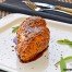 Sirve las berenjenas como base del plato y coloca sobre ellas los muslos de Pollo balsámico de soja, naranja y sésamo, termina bañando el plato con un poco de jugo de la cocción.