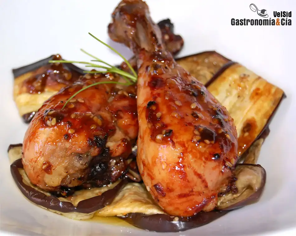 Sirve las berenjenas como base del plato y coloca sobre ellas los muslos de Pollo balsámico de soja, naranja y sésamo, termina bañando el plato con un poco de jugo de la cocción.