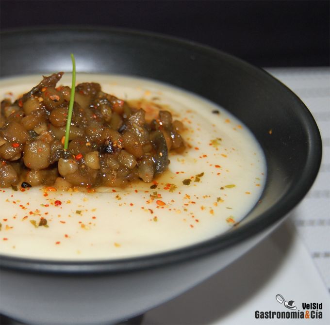 Hoy como entrante hemos preparado esta receta de Puré de coliflor con brunoise de calamar, un plato aromatizado con aceite de sésamo, salsa de soja y shichimi togarashi para proporcionar un toque oriental.