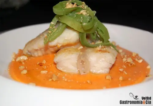 Sirve el Rape con parmentier de piquillos sirviendo el puré como base del plato, dispón sobre él la cola de rape coronándola con la juliana de judías verdes. Termina espolvoreando las avellanas tostadas y regando con un hilito de aceite de oliva virgen extra.