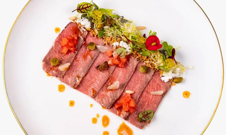 Ilustrando estas líneas podéis ver la receta de roast beef de presa ibérica, encurtidos, migas y tomate de Sergio y Javier Torres, es un plato perfecto para una comida especial, ¡qué fácil será lucirse y hacer disfrutar a los comensales con este manjar! Así que no dejéis de tomar nota de la elaboración paso a paso porque es muy sencilla. Y si os apetece, podéis probar esta misma receta con otras piezas de carne, así como sustituir guarniciones para crear vuestra armonía favorita. Vais a comer de lujo.