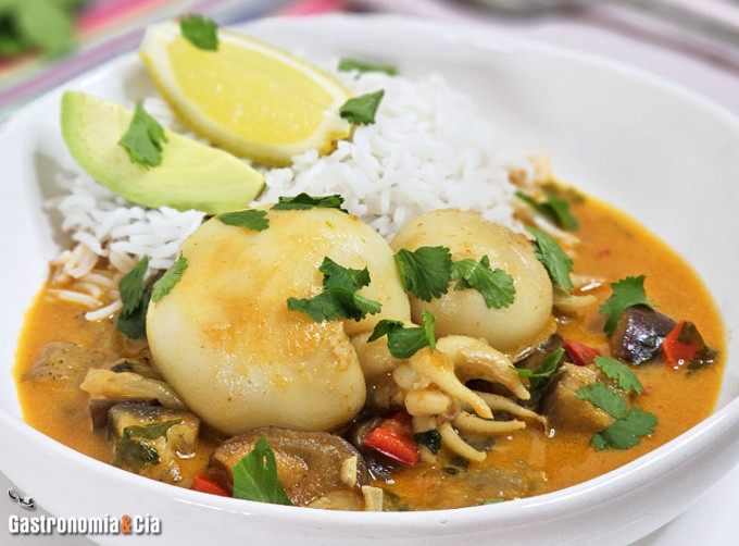 La receta es de unas enteritas, nombre que reciben en la Comunidad Valenciana las sepias de pequeño tamaño y que se cocinan enteras, acompañadas con berenjena guisadas con leche de coco y gochu jang. Ya sabéis que se trata de una pasta fermentada de chile tradicional de la cocina coreana que tiene un sabor único, pero si no os gusta el picante, podéis hacer esta misma sepia y berenjena con salsa de coco sin gochu jang. En ese caso le añadiríamos un poco de passata.