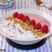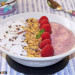 Reparte a un lado del bol los chips de coco, a continuación forma una línea recta con la soja texturizada y a su lado coloca las frambuesas frescas. Para terminar, reparte los nibs de cacao.