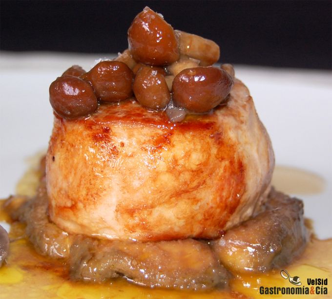 Sirve como base una rodaja de foie, sobre ella coloca el solomillo y corona con las setas, reparte el resto de setas en los platos. Sazona el Solomillo con foie y setas con un poco de sal Maldon y riega con un poco de jugo del caramelo del foie.