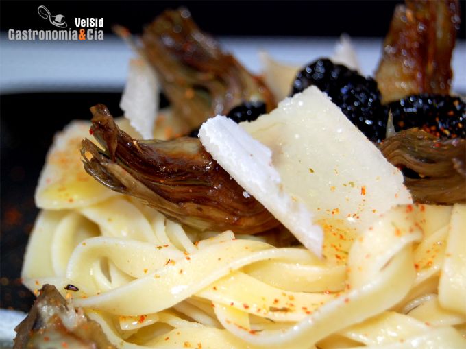 Hoy hemos preparado como entrante esta receta de Tallarines con alcachofas y tomates secos confitados. Tenemos unas alcachofas de Benicarló que están irresistibles, en esta época, al menos dos o tres veces por semana hacemos platos con alcachofas para recuperar los meses en los que no están de temporada, sólo echamos de menos unas buenas brasas para asarlas…