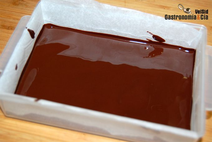 Funde al baño maría 100 gramos de chocolate fondant al 70%, mientras tanto prepara el molde de turrón forrándolo con papel sulfurizado. Cuando el chocolate se haya fundido vierte en el molde una finísima capa, mueve el molde para que el chocolate cubra totalmente su base. Deja enfriar y solidificar.