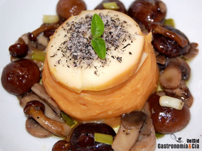 Parmentier de boniato con setas y scamorza ahumada