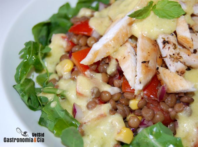 Ensalada de lentejas con pollo y vinagreta de hierbabuena