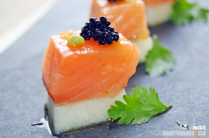 Sopa de melón al jengibre con atún teriyaki y aguacate