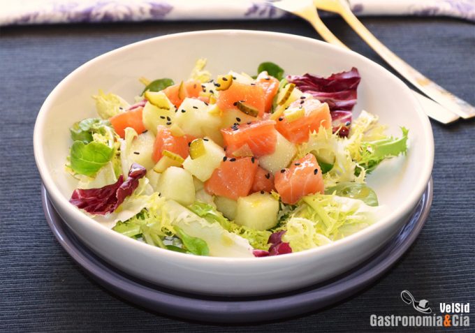 Ensalada de melón, queso feta y vinagreta de anchoas