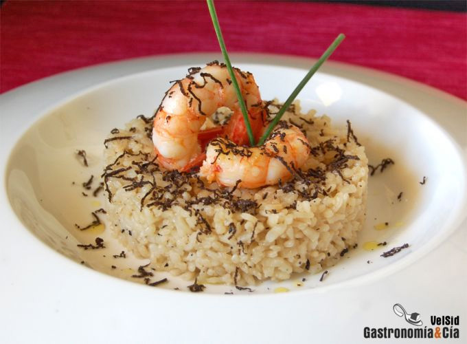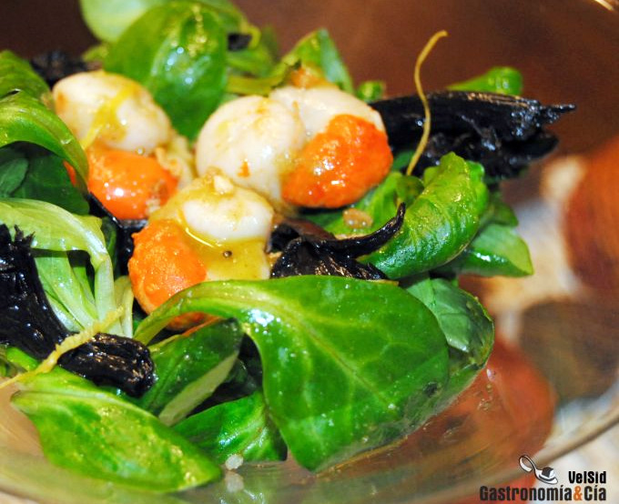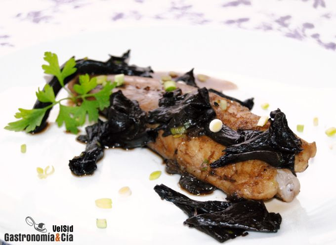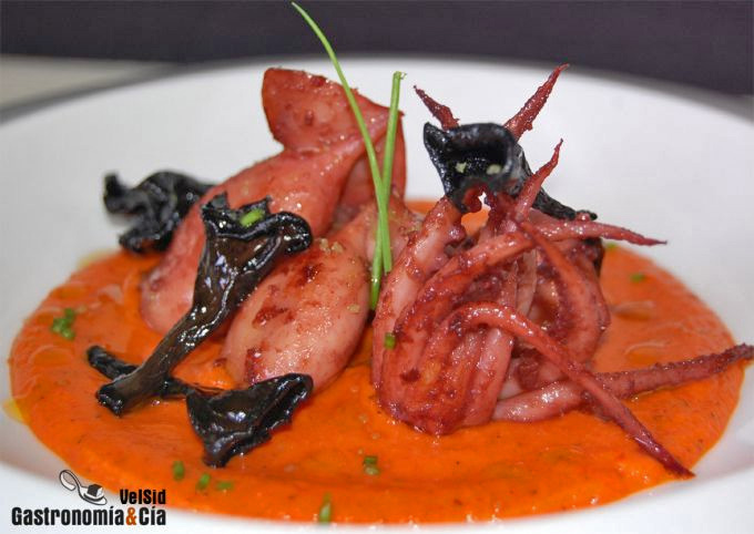 Chipirones con salsa de pimientos y trompetas de la muerte
