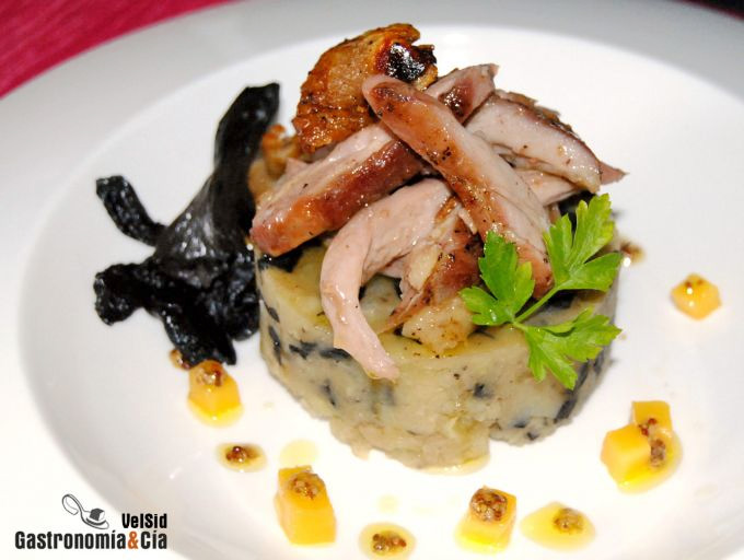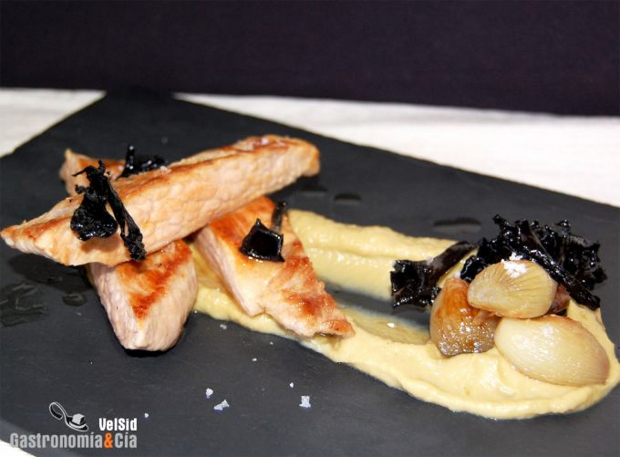 Magret de pato con salsa de uvas y trompeta de la muerte