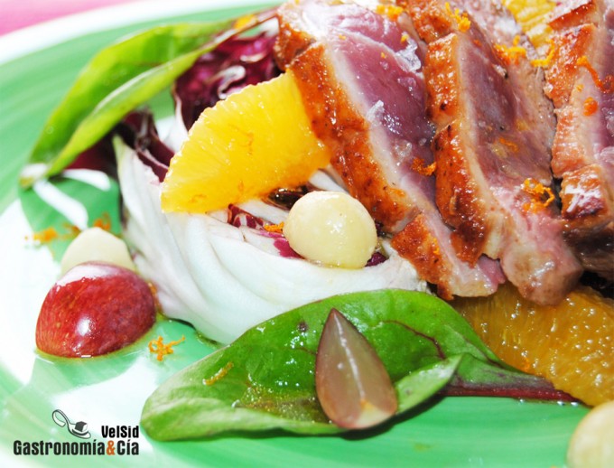 Magret de pato con salsa de uvas y trompetas de la muerte