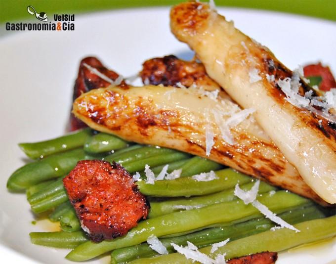 Judías verdes con espárragos ahumados y chistorra (Se puede prescindir de la chistorra)