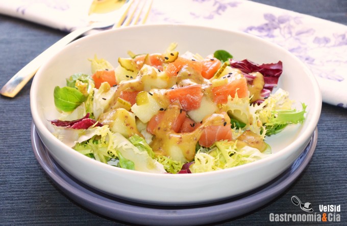 Ensalada de salmón marinado, melón y mostaza