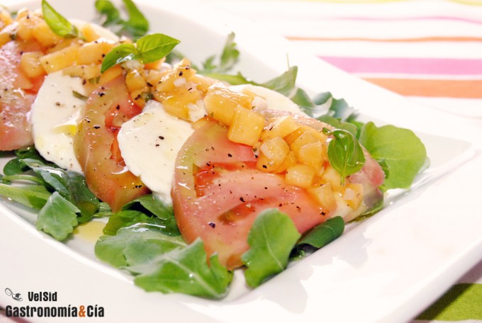 Ensalada de tomate y rúcula con vinagreta de melocotón