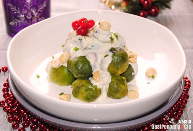 Coles de Bruselas con salsa de queso azul, avellanas y pasas
