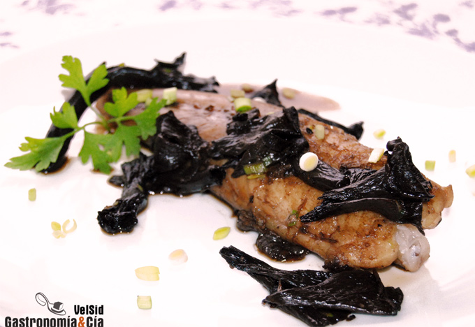 Salmón con crema de almendras ahumada y trompeta amarilla