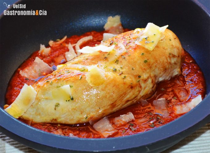 Pollo relleno de tomate y mozzarella con arroz al vino