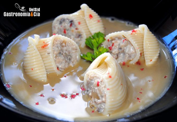 Galets rellenos de espinacas y bacalao con caldo de ajos tostados