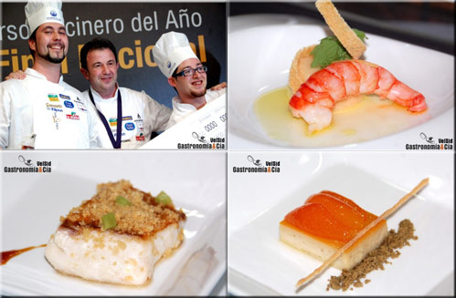 Evidentemente, no menos apetecible es el menú con el que José Carlos Fuentes se ha alzado con el título de Mejor Cocinero del Año 2010, título que portará durante dos años, hasta que en 2012 se vuelva a celebrar la gran final de este concurso de cocineros. Ya visteis algunas fotos en el post Concurso Cocinero del Año en imágenes, pero las volvemos a incluir a continuación con la explicación del chef para hacer la receta. Ya puedes invitar a quien quieras a comer tu menú compuesto por Cola de gamba roja hervida, pan con tomate ahogado en aceite de oliva virgen y hierbas de margen, Pargo sin piel ni espinas recubierto en polvo de cortezas de cerdo y jugo concentrado de las espinas con infusión de nopal, y como postre, Sabores de Oriente: flan chino, tierra de té verde japonés y kumquats. Muy descriptivo ¿verdad?.