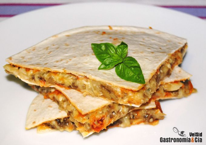 Tortilla rellena de berenjena, queso y mojo de tomate y ajo asado
