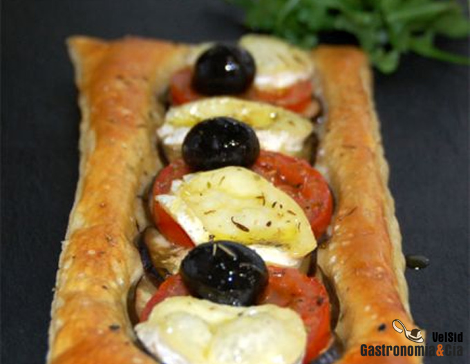 Hojaldre de berenjena, tomate y queso de cabra