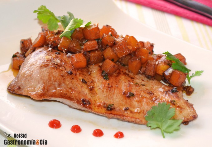 Secreto de cerdo con calabaza salteada