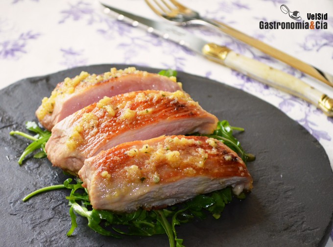 Secreto de cerdo con ajo asado y parmesano