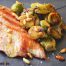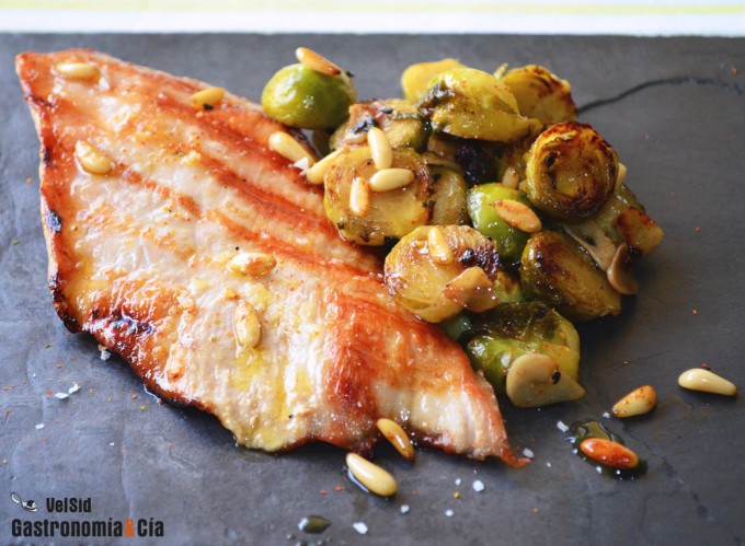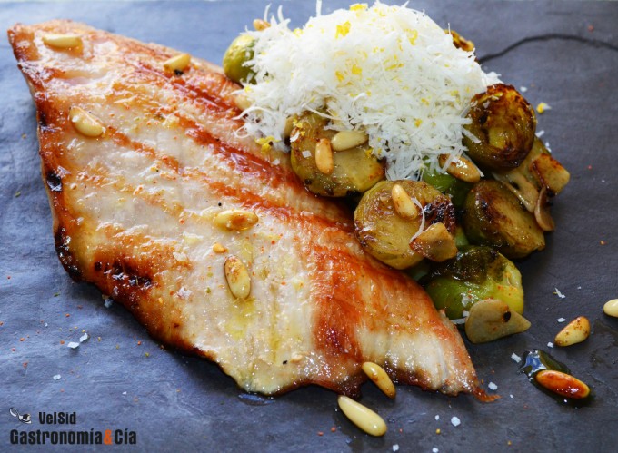 Secreto de cerdo con coles de Bruselas, limón y parmesano