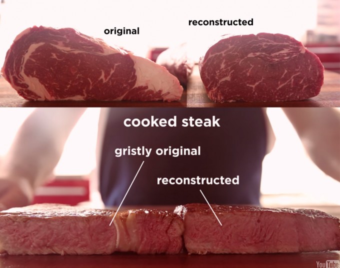 Del pegamento para carne hablaremos con más detalle próximamente, ahora vamos a ver cómo reconstruir una pieza de carne cruda en el vídeo de ChefSteps. La finalidad es obtener una pieza limpia de tejido conectivo para poder obtener mejores cortes, en la foto que ilustra este post podéis ver el antes y el después.