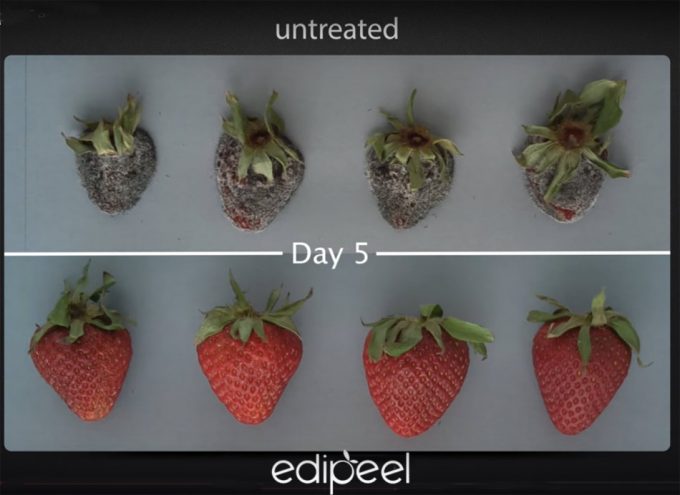 En el vídeo podéis ver diferentes comparativas que seguramente os sorprenderán, en el primer ejemplo aparece un limón sin el recubrimiento y otro al que se le ha aplicado Edipeel, podéis ver que la vida útil de la fruta se extiende de los 30 a los 54 días. Otro ejemplo son unas fresas con y sin el recubrimiento, a partir del segundo día se empiezan a apreciar los signos de degradación, en cinco días las fresas sin Edipeel están completamente degradadas, sin embargo, las que han recibido el recubrimiento se mantienen prácticamente como el primer día.
