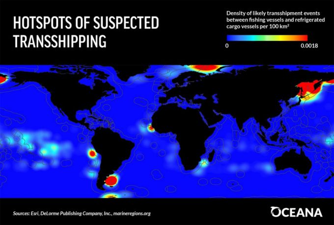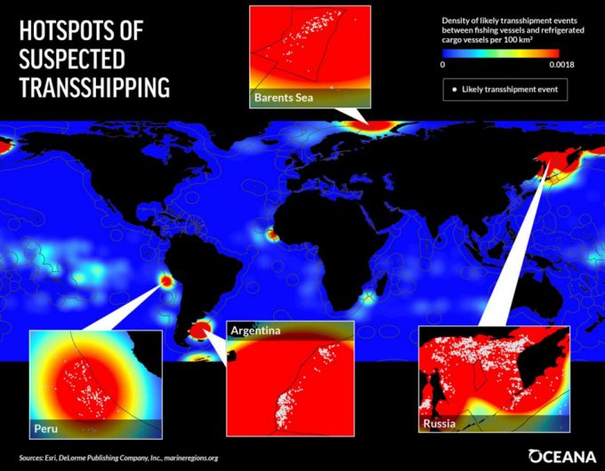Debido al transbordo de capturas, los pesqueros permanecen alejados durante largos periodos de tiempo en las zonas antes indicadas, a ellos acceden los buques frigoríficos que se encargan de recoger las capturas y de suministrar combustible y otros artículos a los pesqueros para que sigan en alta mar con su actividad. De este modo, los infractores pueden seguir pescando y estar fuera del alcance de las autoridades, así como seguir utilizando trabajadores esclavos sometidos a todo tipo de abusos y vejaciones. Oceana apunta que si bien en algunos casos el transbordo de capturas puede ser legal, en otros casos facilita que se blanqueen las capturas.