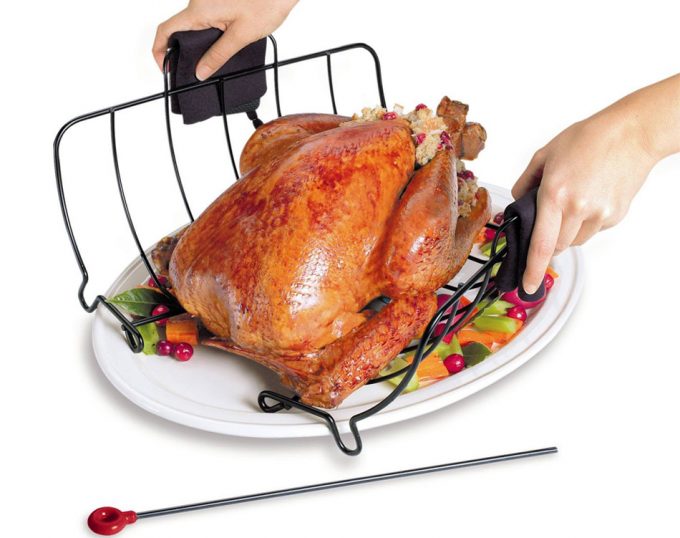 Seguimos descubriendo utensilios de cocina interesantes y muy útiles, por no decir imprescindible, para las ocasiones en las que cocinamos un pavo asado o alguna otra ave de gran tamaño y no queremos jugárnosla a la hora de pasarla a la bandeja de servicio. Al ser un asado grande y que queda muy tierno, puede romperse, caerse o simplemente estropearse si no se alza con cuidado de la bandeja del horno para pasarlo a la bandeja de servicio.