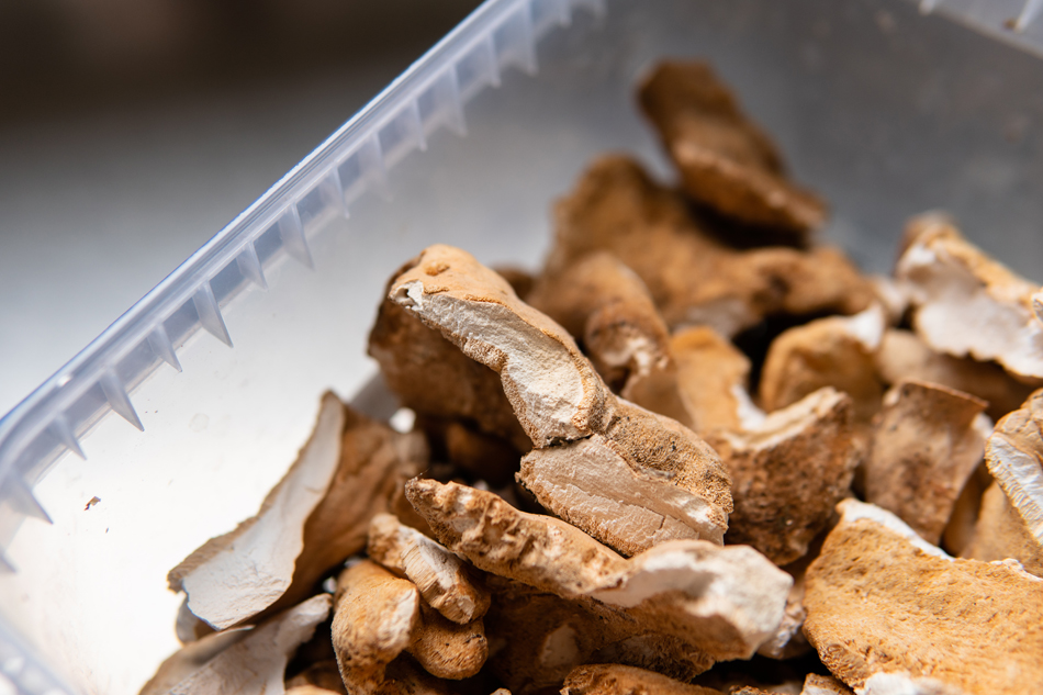 Y es que una de las pegas de hacer este tipo de elaboraciones es que un alimento que tiene cierto volumen y que debe colocarse bien extendido para que se seque bien y de forma homogénea, ocupa mucho espacio, y lo que pones en una bandeja o rejilla después se queda en nada, acaba ocupando sólo un plato. Así que es cuestión de hacer varias tandas o de intentar montar un soporte con varias repisas que entren en el horno.