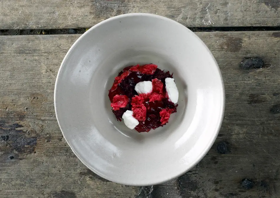 No es un postre al uso, este plato de otoño e invierno es como una ensalada de remolacha y frambuesas en distintas texturas condimentada con vinagre y sal, podría ser incluso una guarnición. Que no sorprenda el uso de hielo (con sabor) por ser un plato para los meses más fríos, y sobre el lácteo del postre, se puede elegir de vaca, de oveja… En cualquier caso, podéis aprender y disfrutar conociendo algo de la cocina sueca con esta receta de Remolacha roja con frambuesa y yogur de Magnus Nilsson