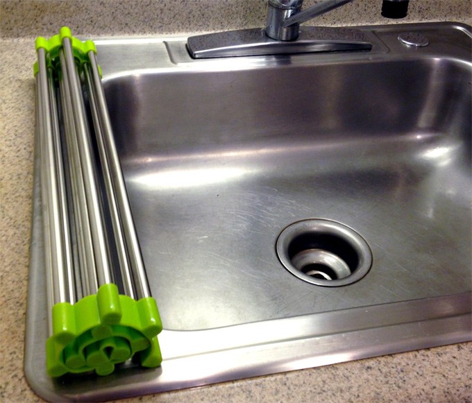 Como está formada por barras que se unen mediante unas piezas de silicona flexible, cuando no se va a usar se puede plegar enrollándola muy fácilmente y así no obstaculizar en el uso del fregadero. Pero si se prefiere, porque no se vaya a usar a menudo, se puede guardar en un cajón y no ocupará mucho espacio.