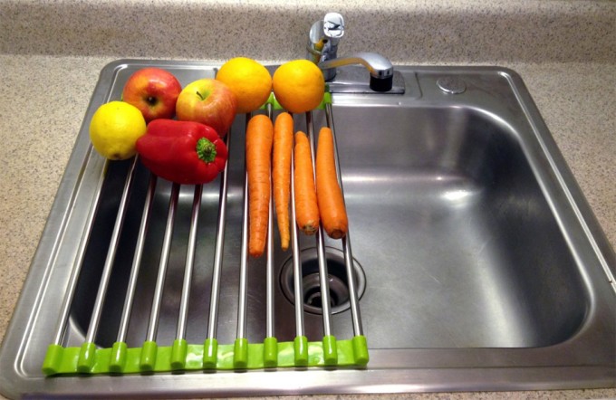 Cuando lavamos las frutas y hortalizas que vamos a preparar para cocinar o para comer, podemos utilizar un colador para escurrirlas, colocarlas sobre un paño o sobre papel de cocina absorbente, o entre otras cosas, hacer uso de un utensilio como el que podéis ver en la foto, nos ha parecido curioso y práctico, a ver qué os parece a vosotros. Se llama Folding Drain Rack y es una repisa de drenaje plegable.