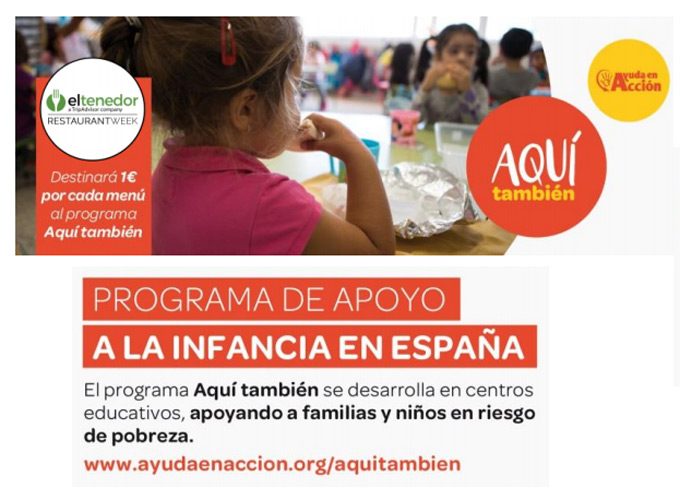 Además, la semana de los restaurantes es un evento con un perfil solidario porque colaboran con Ayuda en Acción aportando 1 euro por cada menú vendido, es decir, los clientes pueden disfrutar de un menú a precio cerrado en cualquiera de los restaurantes participantes, el precio del menú es de 25 euros, 24 son para el establecimiento y 1 euro es para la ONG, concretamente para el programa ‘Aquí también’ de Ayuda en Acción, cuyo objetivo es reducir la desigualdad social y paliar la pobreza infantil en España.