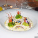 Pero, no penséis que la cosa cambió, lo que sí nos cambiaron fue el vino para que degustáramos el Tamerán, un vino blanco elaborado con Verdello y con algo de barrica. Un vino con cuerpo y delicioso para acompañar el plato de Camarón de Mogán, aguacate y almendra, ésta última en forma de sopa, o de salsa, como diría Ferrán Adrià. Del plato no sólo destacan los colores y la frescura, también su armonía en cuanto a texturas y un extraordinario sabor.