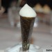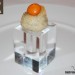 En superficies de metacrilato se presentaba una Tempura de atún y berenjena con salsa romesco, un Berberecho con gelée de moscatel y aire de manzana verde, una Nuez de roquefort (rellena con nuez tierna), un Cono de alga nori con tartar de atún y crema de yuzu, y un Bombón de pomelo. Este primer acercamiento delata lo mencionado anteriormente, producto, sabor, técnica… destacar la perfecta tempura de berenjena y atún, crujiente y fina y con un delicioso sabor ahumado, la crujiente alga nori y la crema de yuzu, golosa y refrescante, y también el Bombón de pomelo, una semiesfera helada, con una fina capa crujiente que se funde en el paladar con la cremosidad de la manteca de cacao, y el corazón líquido, cítrico equilibrado, muy agradable.