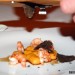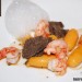 La velada fue a buen ritmo, empezamos con los entrantes, que fueron tres. Gnocchi de boniato con trufa, gambitas y queso parmesano, éste en forma de aire. Los gnocchi siguen la técnica de la esferificación, respetando su sabor, muy ricos, y bien combinados con unas gambitas sabrosas y la trufa negra recién laminada, como podéis ver en las fotos, en la misma mesa.