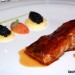 El cordero cocinado durante 24 horas a 64º C nos pareció un auténtico manjar, una carne de sabor suave, tierna y jugosa, con una fina corteza crujiente, en el plato se acompaña de unos discos de polenta cubiertos con trompetas de la muerte confitadas y una quenelle de tomate natural y salvia.