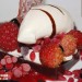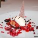 Pasamos a los postres con un vino dulce, un Noe P.X, goloso sin empalagar, fresco, untuoso, un regalo para el paladar obtenido mediante el sistema de criaderas y soleras en bota de roble americano con más de 30 años. Y dos postres, Frutos rojos, queso fresco y helado de vinagre balsámico, un buen postre para limpiar el paladar con frutos rojos naturales, elaboraciones de los mismos con nitrógeno líquido y también en forma de gelatina. Sobre ella, un trabajado mascarpone y el helado cremoso de vinagre balsámico, muy suave.