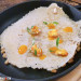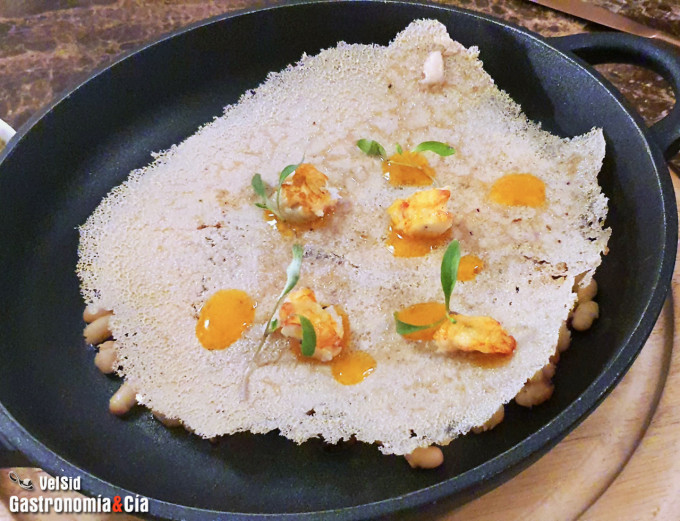 Continuamos con uno de los platos que, tal vez, podemos considerar el mejor (y hoy en el mercado hemos comprado uno de los ingredientes para intentar reproducirlo), se trata de los Fesols de Santa Pau con tortita crujiente de pies de cerdo, butifarra de Perol y cigalitas. Tenéis la foto y también tenéis en el vídeo cómo lo prepara Estela para la degustación, está exquisito porque hay buen producto y hay buena cocina.