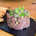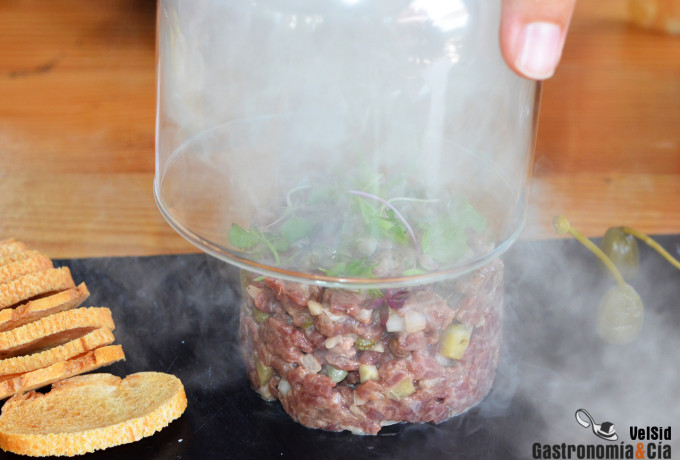 Como entrantes fríos, elegimos una ensalada de Tomate del Maestrazgo, ventresca de atún, aguacate y piparras que nos encantó, aquí manda el producto. Mientras que en el saber hacer del cocinero está el éxito del Steak tartar ahumado con su toque valiente, que como veis, llega a la mesa tapado con su campana llena de humo. También tomamos un entrante caliente, el Pulpo con patata chafada, aceite de oliva, kimchi y rúcula.