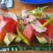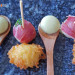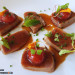 En la galería de imágenes, y entre estas líneas, podéis ver parte de la oferta culinaria que tiene Carlos Miralles Vericat en su carta, ofrece una cocina mediterránea fresca, con algunas pinceladas de cocina fusión, creativa, sin estridencias, sensata y lógica, con gusto y, en general, con equilibrio. Como cortesía de la casa, empezamos con unos aperitivos compuestos por tres bocados, un buñuelo de bacalao jugoso y rico, una bolita de refrescante melón con jamón y una aceituna líquida, la ya clásica esferificación de aceituna. Una buena forma de empezar.