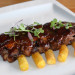 En cuanto a los platos principales, tomamos el Lomo de atún rojo en tataki con cerezas, ponzu y lima, un buen pescado, en su punto de cocción, y deliciosa su combinación con la salsa y las cerezas. Pero más sabrosa estaba la Costilla ibérica a baja temperatura con reducción de miel, tierna y melosa, aunque pecaba ligeramente de un exceso de miel.